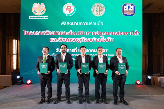 บมจ.พีทีจี เอ็นเนอยี (PTG) ลงนามความร่วมมือกับมูลนิธิแม่ฟ้าหลวง ในพระบรมราชูปถัมภ์ กรมป่าไม้ และธนาคารเพื่อการเกษตรและสหกรณ์การเกษตร (ธ.ก.ส.) เพื่อดำเนินโครงการการ พัฒนาและส่งเสริมการปลูกกาแฟอาราบิก้าและพืชเศรษฐกิจอย่างยั่งยืน ในพื้นที่ที่มีความเหมาะ สมทางสภาพแวดล้อมและชุมชนในประเทศไทยเพื่อร่วมสร้างโอกาสและยกระดับคุณภาพชีวิตของเกษตรกรผู้ผลิตกาแฟมีรายได้และมีชีวิตความเป็นอยู่ที่ดีขึ้น ส่งตรงร้าน “กาแฟพันธุ์ไทย”