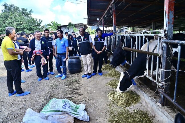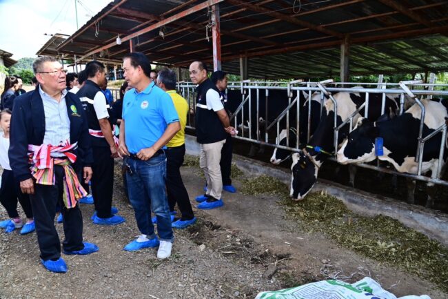 จากนั้นรมช.เกษตรฯ และคณะ เดินทางเยี่ยมชมฟาร์มโคนมต้นแบบ “ภูพานเพชร” ของนายสมพงษ์ ภูพานเพชร ประธานชุมนุมสหกรณ์โคนมแห่งประเทศไทย (จำกัด) ซึ่งมีการส่งเสริมการใช้ข้าวโพดหมักเพื่อเพิ่มประสิทธิภาพผลผลิตโคนม โดยมีโคที่เลี้ยงทั้งหมด 115 ตัว โครีด 53 ตัว โคพักรีด 14 ตัว โคสาว 21 ตัว โครุ่น 21 ตัว ลูกโค 6 ตัว ซึ่งศูนย์วิจัยและพัฒนาอาหารสัตว์นครราชสีมา กรมปศุสัตว์ได้ให้คำแนะนำปรับสูตรอาหารตามประสิทธิภาพการผลิต ทำให้มีปริมาณนมเพิ่มขึ้น 41% จากเดิม ปริมาณนมเฉลี่ย 11.24 กก./ตัว/วัน เพิ่มขึ้นเฉลี่ยเป็น 15.92 กก. /ตัว/วัน ส่งผลให้มีรายได้เพิ่มขึ้นอีกด้วย