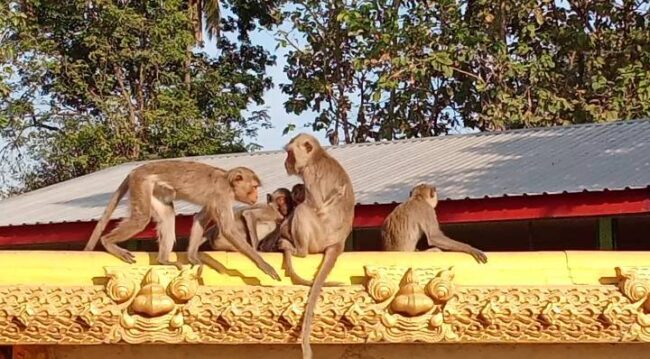 ส่วนบริเวณลานวัดก็พบฝูงลิงอีกจำพวก นั่งเรียงกันอยู่จำนวนมาก ที่นั่งผิงแดด เพื่อผ่อนคลายอริยบทและคลายความหนาวขณะที่บางตัวทนหนาวไม่ไหวก็ต้องมานั่งกอดกันกลมเป็นภาพที่น่ารักน่าเอ็นดูเป็นอย่างมาก