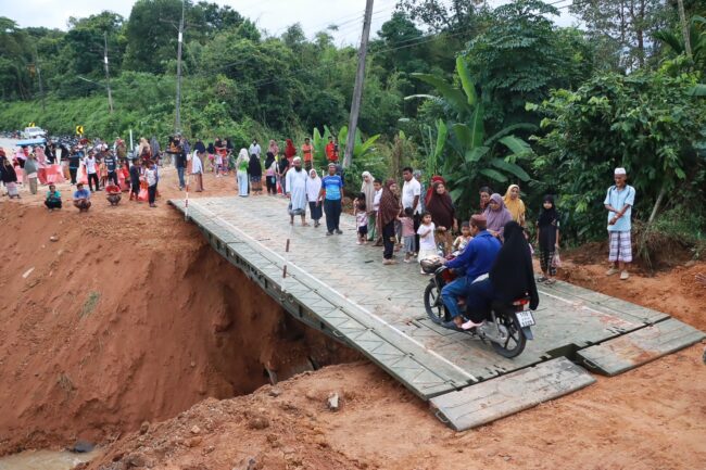 ทั้งนี้ ชาวบ้านเดือดร้อนมาก หากมีความจำเป็นต้องเดินทางสู่ตัวอ.สุคิริน ต้องเดินทางอ้อมถนนเส้นทางสายบ้านปารีย์ ซึ่งมีระยะทางไกลประมาณ 10 ก.ม. และผลพวงจากมวลน้ำป่ากัดเซาะในครั้งนี้ ทำให้ถนนถูกตัดขาดลึก 5 เมตร กว้าง 20 เมตร พล.ต.เฉลิมพร ผบ.ฉก.นราธิวาส ได้สั่งการให้ พ.ท.ฐาปกรณ์ หรั่งอินทร์ ผู้บังคับกองพันทหารช่างที่ 15 กองพลทหารราบที่ 15 นำกำลังพลพร้อมรถแบกโฮ มาทำการปรับพื้นที่ ก่อนที่จะติดตั้งสะพานแบบเร่งด่วน ชาวบ้านจะเรียกติดปากว่า สะพานแบริ่ง หรือ Modular Fast Bridge (MFB) จำนวน 1 ท่อน ยาว 15 เมตร กว้าง 3.8 เมตร สามารถรับน้ำหนักได้มากถึง 60 ตัน