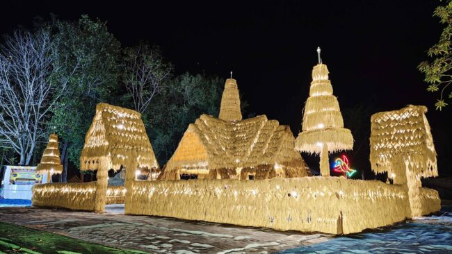 พระครูปรีชา กิจจาทร เจ้าอาวาสวัดหนองยายเทียม ต.หนองบุนนาก อ.หนองบุญมาก จ.นครราชสีมา พร้อมคณะสงฆ์และชาวบ้านผู้มีแรงศรัทธา ร่วมใจช่วยกันนำเอาฟ่อนข้าวเปลือกที่ได้จากการเก็บเกี่ยวผลผลิตจากนาบุญ 4 ไร่ ที่ทางพระสงฆ์และชาวบ้านได้ช่วยกันปลูกและเก็บเกี่ยวผลผลิตมารังสรรค์ขึ้นเป็นปราสาทข้าวเปลือกขนาดใหญ่และสวยงามเพื่อเตรียมจัดงาน “บุญลานสามัคคี สดุดีบูรพาจารย์ สร้างตำนานพืชไร่ ใส่ใจวัฒนธรรม” ที่จะมีขึ้นรับเทศกาลส่งท้ายปีเก่าต้อนรับปีใหม่ในระหว่างวันที่ 27 ธ.ค.67 ถึงวันที่ 2 ม.ค.68 นี้ พร้อมยังมีการประดับประดาไฟและตกแต่งสถานที่เอาไว้อย่างงดงามตระการตา เป็นภาพที่หาชมได้ยากยิ่งแล้วในปัจจุบัน