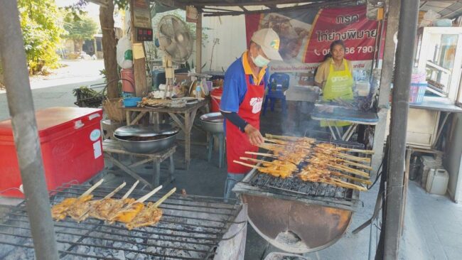 เจ้กรูดไก่ย่างพิมาย เจ้าของร้าน เปิดเผยว่า ตนขายไก่ย่างมานานกว่า 30 ปี การันตีความอร่อยด้วยสูตรเด็ดของร้าน และสะอาดปลอดภัย ราคาไม่แพง คุ้มค่าที่ได้มาทาน ซึ่งเหมาะอย่างมากในช่วงอากาศหนาว ได้รับประทานอุ่นๆ พร้อมกับครอบครัว อิ่มสบายท้อง ซึ่งไก่ย่างของตน จะหมักเครื่องเทศจนเข้าเนื้อ เมื่อนำไปย่างจะหอมกรุ่น เมื่อนำมาน้ำจิ้มมะขามสูตรเจ้กรูด ทานกับข้าวเหนียวร้อนๆ จะอร่อยมาก แถมยังมีกระเทียมพริกไทยโรยให้เคี้ยวกรุบๆ ได้รสชาติโดนใจ