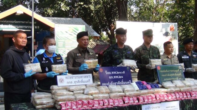 ทหารพรานมุกดาหารสนธิกำลังหน่วยความมั่นคงในพื้นที่ยึดยาบ้า 994,000 เม็ด พร้อมด้วย HAPPY WATER ในรูปแบบคอลลาเจนริมฝั่งแม่น้ำโขง