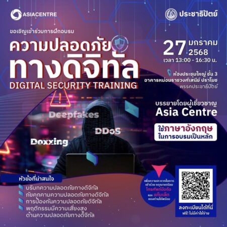 ทั้งนี้พรรคประชาธิปัตย์ร่วมกับAsia Centerจัดการอบรมเชิงปฏิบัติการหัวข้อ “ความปลอดภัยทางดิจิทัล” เมื่อวันที่27 มกราคมที่ผ่านมาโดยมีนายสันชัย กาเธีย( Mr. Sanjay Gathia )ผู้จัดการโครงการ จาก Asia Centre มาให้ความรู้เรื่องภัยคุกคามความปลอดภัยทางดิจิทัล เช่น Doxxing, DDoS, Phishing, Malware, AI Deepfakes, Data Breaches และการป้องกันความปลอดภัยดิจิทัล เช่น การป้องกันตัว การจัดรหัสผ่าน การใช้โปรแกรมป้องกันขั้นสูง และกลไกการป้องกันอื่นๆ โดยมีผู้เข้ารับการอบรมมาจากสาขาพรรค ตัวแทนพรรค ภาคเอกชนและภาคส่วนต่างๆซึ่งทุกคนได้แลกเปลี่ยนประสบการณ์และนำเสนอข้อคิดเห็นต่อการป้องกันภัยดิจิทัลเป็นการสร้างการตื่นตัวและให้ความรู้ไปเผยแพร่ต่อผู้อื่นและในองค์กรต่อไป.