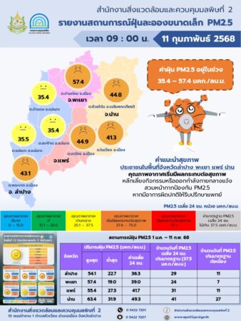 สำหรับสถานการณ์ค่าฝุ่นละอองขนาดเล็กของจังหวัดน่าน วันนี้ พบว่า ต.ในเวียง อ.เมืองน่าน และ ต.ห้วยโก๋น อ.เฉลิมพระเกียรติ เกินค่ามาตรฐาน และเริ่มส่งผลกระทบต่อสุขภาพประชาชน