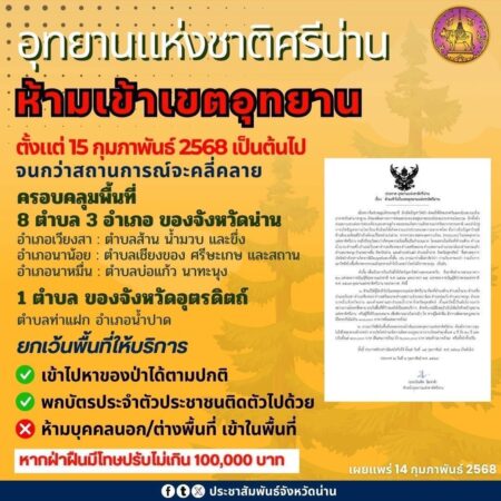 นอกจากนี้ อุทยานแห่งชาติศรีน่าน ได้ออกประกาศห้ามเข้าไปในเขตอุทยานฯ โดยมีผลตั้งแต่ 15 กุมภาพันธ์ 2568 เป็นต้นไป ยกเว้นพื้นที่ที่กำหนดให้เป็นเขตบริการ ประชาชนในท้องที่ตำบลส้าน ตำบลน้ำมวบ ตำบลตำบลขึ่ง อำเภอเวียงสา, ตำบลเชียงของ ตำบลศรีษะเกษ ตำบลสถาน อำเภอนาน้อย, ตำบลบ่อแก้ว ตำบลนาทะนุง อำเภอนาหมื่น จังหวัดน่าน