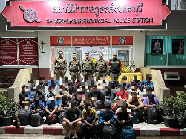 หลังรับรายงานจึงสั่งการให้ พ.ต.ต.ประดิษฐ์ แร่เพชร สว.ธร.ฯ รรท.สวป.สภ.สังขละบุรี ร่วมกับเจ้าหน้าที่ ตร.สายตรวจรถยนต์ เจ้าหน้าที่ชุดเฉพาะกิจ (ปะ ฉะ ดะ)เจ้าหน้าที่สายตรวจน้ำเกิ๊ก เจ้าหน้าที่จราจร และเจ้าหน้าที่ชุดส่งกำลังบำรุง นำกำลังไปตรวจสอบ พบแรงงานต่างด้าวชาวเมียนมา เป็นจำนวนมากหลบซ่อนตัวอยู่จริง เจ้าหน้าที่จึงปิดล้อมพร้อมแสดงตัวเข้าจับกุม เมื่อกลุ่มแรงงานเห็นเจ้าหน้าที่บางคนพยายามหลบหนีแต่เจ้าหน้าที่ก็สามารถจับกุมตัวเอาไว้ได้เป็นชายทั้งหมด จำนวน 36 คน อายุเฉลี่ย 14-40 ปี ผู้ต้องหาทั้ง 36 คนไม่มีเอกสารการได้รับอนุญาตให้เข้ามาในราชอาณาจักรไทยมาแสดงต่อเจ้าหน้าที่ อีกทั้งสื่อสารภาษาไทยไม่ได้ เจ้าหน้าที่จึงนำตัวผู้ต้องหาทั้งหมดมาสอบปากคำเพิ่มเติมที่ สภ.สังขละบุรี