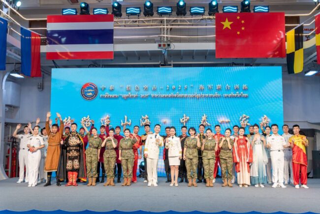 บนเรือรบจีน บริเวณท่าเทียบเรือ Maxie เมืองจ้านเจียง สาธารณรัฐประชาชนจีน กองทัพเรือสาธารณรัฐประชาชนจีน ได้จัดงานเลี้ยงรับรองกำลังพลหมู่เรือฝึกผสม Blue Strike 2025 บนเรือรบจีน ในโอกาสที่เดินทางเข้าร่วมการฝึกผสม Blue Strike 2025
