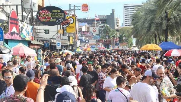 “ไหลพัทยา” ยังดึงดูดคลื่นมหาชนทั้งไทย-เทศหลายหมื่นคนแห่ร่วมเล่นสาดน้ำสงกรานต์ได้แน่นถนนสายชายหาด ยิ่งค่ำยิ่งสนุกท่ามกลางการดูแลความปลอดภัยของตำรวจหลายโรงพัก กวดขันไม่เล่นกระบอกท่อพีวีซี-ดินสอพอง เข้มตรวจอาวุธก่อนเข้างาน