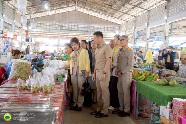 นางสาวชนมนัฐ รอดบุญธรรม รองผู้ว่าราชการจังหวัดศรีสะเกษ หัวหน้าคณะกรรมการประเมินตลาดดีมีมาดากฐานองค์การบริหารส่วนท้องถิ่น เดินตรวจประเมินตลาดสดเทศบาลตำบลขุนหาญ