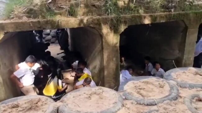 กำนัน แนวชายแดนกัมพูชา ด้านอำเภอขุนหาญ จังหวัดศรีสะเกษ นำชาวบ้านนักเรียน ฝึกการซักซ้อมตามแผนเผชิญเหตุวิ่งเข้าหลุมหลบภัยหนีกระสุนปืน