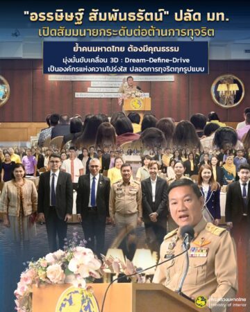 “อรรษิษฐ์ สัมพันธรัตน์” ปลัด มท. เปิดสัมมนายกระดับต่อต้านการทุจริต ย้ำ คนมหาดไทยต้องมีคุณธรรม มุ่งมั่นขับเคลื่อน 3D : Dream-Define-Drive ไปให้ถึง Goal เดียวกัน เป็นองค์กรแห่งความโปร่งใส ปลอดการทุจริตทุกรูปแบบ