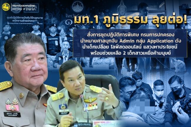 ปลัด มท.เผย “มท.1 ภูมิธรรม” สั่งการชุดปฏิบัติการพิเศษกรมการปกครองบูรณาการนำหมายศาลบุกจับ Admin กลุ่ม Application ดัง นำเด็กสาวมาเปลือยไลฟ์สดออนไลน์แสวงหาประโยชน์ พร้อมช่วยเหลือ 2 เหยื่อค้ามนุษย์ พบอายุต่ำสุดเพียง 16 ปี ดำเนินการตามขั้นตอนต่อไป