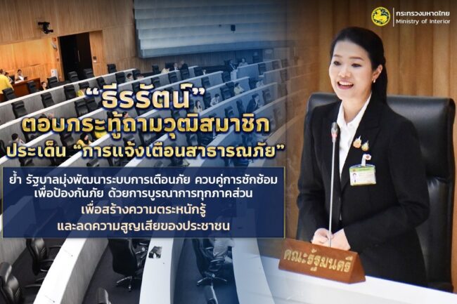 “ธีรรัตน์” ตอบกระทู้ถามวุฒิสมาชิก ประเด็น “การแจ้งเตือนสาธารณภัย” ย้ำ รัฐบาลมุ่งพัฒนาระบบการเตือนภัยควบคู่การซักซ้อมเพื่อป้องกันภัยด้วยการบูรณาการทุกภาคส่วน เพื่อสร้างความตระหนักรู้และลดความสูญเสียของประชาชน