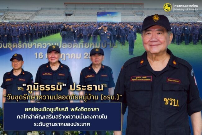 “ภูมิธรรม” เป็นประธานงาน “วันชุดรักษาความปลอดภัยหมู่บ้าน (ชรบ.)” ยกย่องเชิดชูเกียรติพลังจิตอาสาของอาสาสมัครผู้ปฏิบัติหน้าที่รักษาความปลอดภัยในหมู่บ้าน กลไกสำคัญในการเสริมสร้างความมั่นคงภายในระดับฐานรากของประเทศ