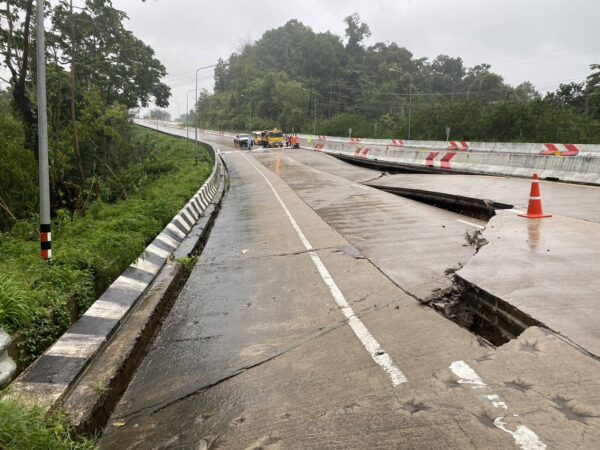 จากการที่ได้เกิดพายุฝนตกลงมาอย่างหนักในพื้นที่ชายแดนไทย-เมียนมา จังหวัดตาก ล่าสุด ถนนเส้นทางหลวง ตาก-แม่สอด มีรอยแยกเพิ่มขึ้น และทรุดตัวลงมากขึ้น บริเวณทางหลวงหมายเลข12 ตอนควบคุม 0102 ตอนกลางสะพานมิตรภาพ-แม่ละเมา ที่ กม.24+620-กม.24+700 พบความเสียหายประมาณ 80 เมตร หมายเลข 12 ตอนควบคุม 0100 ตอน ต.พะวอ อ.แม่สอด จ.ตาก ส่งผลให้ในขณะนี้เส้นทางดังกล่าวต้องใช้เส้นทางเบี่ยงในการสัญจร