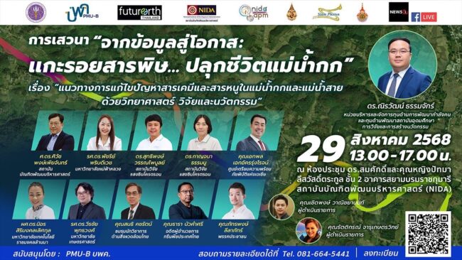 ศูนย์วิจัยและพัฒนาการป้องกันและจัดการภัยพิบัติ สถาบันบัณฑิตพัฒนบริหารศาสตร์(นิด้า) ขอเชิญร่วมงานเสวนา “จากข้อมูลสู่โอกาส: แกะรอยสารพิษ…ปลุกชีวิตแม่น้ำกก” ระดมสมองหาแนวทางแก้ไขปัญหาสารเคมีและสารหนูในลุ่มน้ำกก ด้วยวิทยาศาสตร์ วิจัย และนวัตกรรม