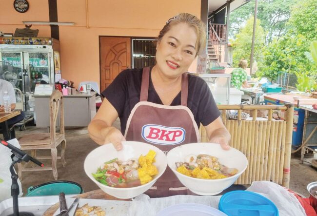 น.ส.ฉวีวรรณ กล่าวอีกว่า ส่วนตนทำเมนูก๋วยเตี๋ยวเอาใจคนรักเส้นด้วยก๋วยเตี๋ยวต้มยำโบราณ ที่รับช่วงมาจากคุณแม่แหยม โดยน้ำซุปสูตรสามเกลอที่เข้มข้น ซิกเนเจอร์ของร้าน คือ ต้มยำโบราณหมูกรอบและเย็นตาโฟหมูกรอบที่เดียวใน อ.ลับแล ทางร้านรับประกันความอร่อยที่มาครั้งแรกแล้วจะต้องแวะมาอีกอย่างแน่นอน ราคาอาหารที่ใส่หมูกรอบเริ่มต้น 60 บาท ไม่มีหมูกรอบ 40 บาท