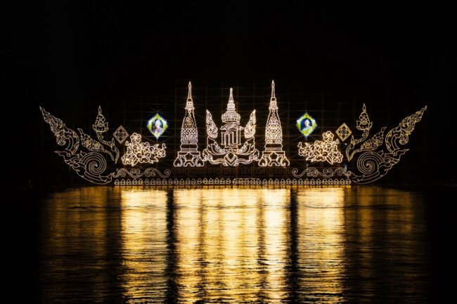 เวลา 19.00 น. ณ ริมฝั่งโขงด้านหน้าสำนักงานการท่องเที่ยวแห่งประเทศไทย สำนักงานนครพนม นายปราชญา อุ่นเพชรวรากร ผู้ว่าราชการจังหวัดนครพนม พร้อมด้วย นางธนวัน อุ่นเพชรวรากร นายกเหล่ากาชาดจังหวัดนครพนม รองผู้ว่าราชการจังหวัดนครพนม หัวหน้าส่วนราชการ และ ประชาชน ทำพิธีปล่อยเรือไฟเฉลิมพระเกียรติ 70 พรรษา สมเด็จพระกนิษฐาธิราชเจ้า กรมสมเด็จพระเทพ พระรัตนราชสุดาฯ สยามบรมราชกุมารี “เทิดพระเกียรติ พระปรีชาเจ้าฟ้าวิศิษฏศิลปิน” ความยาวกว่า 70 เมตร และเรือไฟรักษ์โลก 7 ลำ ความยาวกว่า 20 เมตร จากกลุ่มอำเภอในจังหวัดนครพนม และเรือแสดงเอกลักษณ์ประเทศจีน ลาว เวียดนาม เรือไฟจากมหาวิทยาลัยนครพนมและที่ทำการปกครองจังหวัดนครพนม รวมทั้งหมด 9 ลำ โดยจะมีการปล่อยไหลเรือไฟทุกวันตั้งแต่เวลา 18.30 น. เป็นต้นไป ซึ่งนักท่องเที่ยวสามารถนั่งชมได้ตลอดริมฝั่งโขง เขตเทศบาลเมืองนครพนม