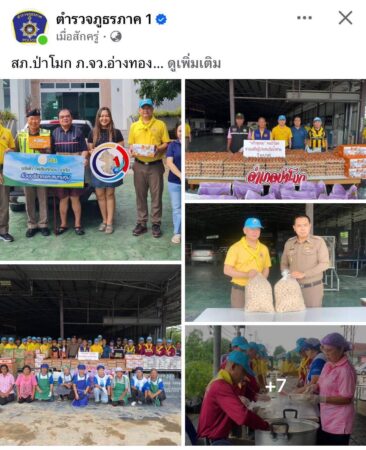 ผกก.สภ.ป่าโมก พร้อมกำลังเจ้าหน้าที่ตำรวจ สภ.ป่าโมก และจิตอาสา เดินทางด้วยเรือไปยัง บ้านสวนยายส้ม หมู่ 4 ตำบลโผงเผง อำเภอป่าโมก จังหวัดอ่างทอง เพื่อมอบอาหารกลางวัน ไข่ไก่ และน้ำดื่มให้แก่ประชาชนที่ได้รับผลกระทบจากอุทกภัย จำนวน 900 กล่อง