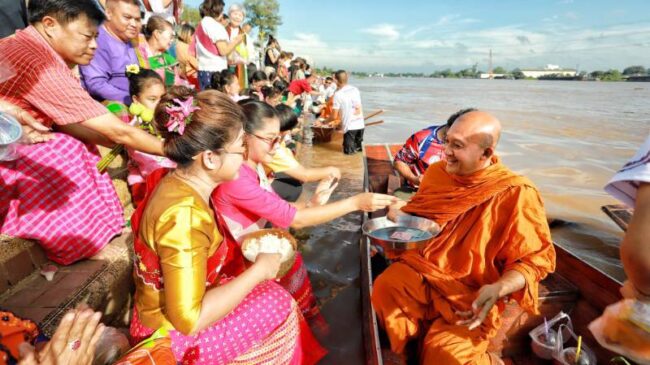 ยิ่งใหญ่อลังการตระการตา ชาวมอญรวมใจตักบาตรพระร้อย วัดชินวราราม สืบสานประเพณีเก่าแก่ ริมฝั่งแม่น้ำเจ้าพระยาเมืองปทุมธานี
