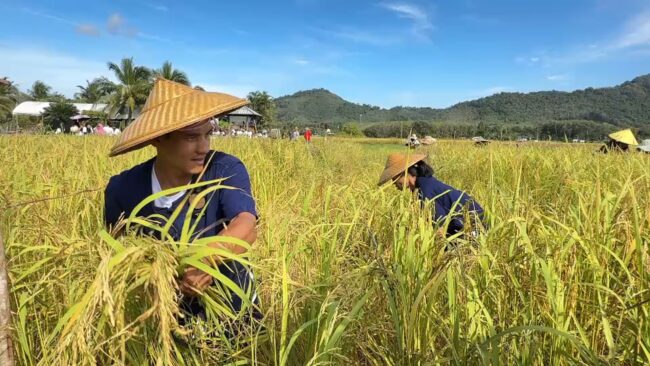 พังงา – หน่วยงานภาครัฐ ภาคเอกชน องค์กรปกครองส่วนท้องถิ่น และประชาชนเกาะยาวจัดงาน “วันอาหารปลอดภัย ข้าวใหม่ปลามัน” ร่วมเก็บเกี่ยวข้าวในนาแปลงใหญ่ที่สุดในทะเลอันดามัน