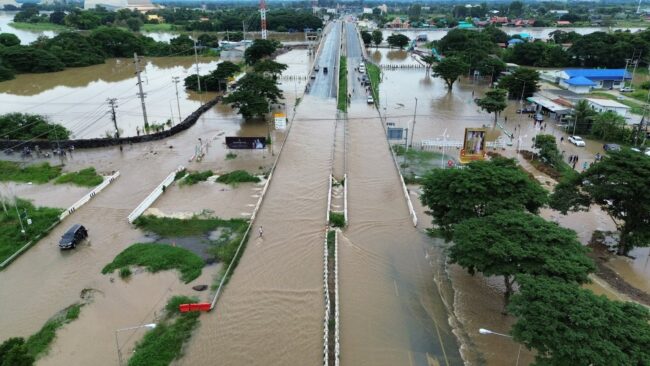 อ่างทอง- พนังกั้นน้ำเจ้าพระยาบริเวณใต้สะพานป่าโมก จ.อ่างทอง พังทลายหลังน้ำเพิ่มสูงต่อเนื่อง ทะลักเข้าท่วมตลาดป่าโมกสูงกว่า 1 เมตร เอ่อล้นถนน 309 ป่าโมก–สุพรรณบุรี รถจมน้ำหลายคัน ตำรวจต้องปิดการจราจร ขณะเจ้าหน้าที่เร่งเสริมคันดินและวางแบริเออร์สกัดน้ำ