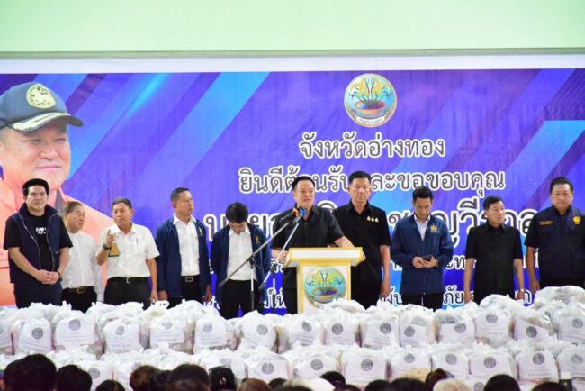 เมื่อวันที่ 12 พฤศจิกายน พ.ศ. 2568 เวลา 12.30 น. นายอนุทิน ชาญวีรกูล นายกรัฐมนตรีและรัฐมนตรีกระทรวงมหาดไทย พร้อมคณะเดินทางมาตรวจราชการจังหวัดอ่างทอง และมอบถุงยังชีพช่วยเหลือผู้ประสบอุทกภัยในพื้นที่ จำนวน 1,500 ชุด