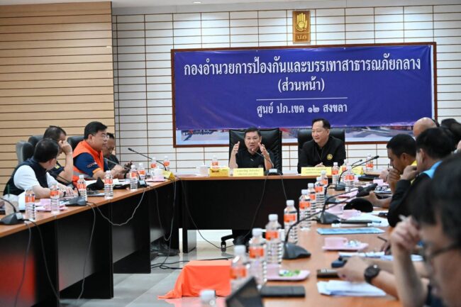 นายชัยรัตน์ แก้วเพียงเพ็ญ รองอธิบดีกรมป้องกันและบรรเทาสาธารณภัย นายเกิดศักดิ์ ยะโสธร รองอธิบดีกรมโยธาธิการและผังเมือง นายจิรวัตร์ มณีโชติ รองผู้ว่าราชการจังหวัดสงขลา หัวหน้าส่วนราชการ ฝ่ายปกครอง สาธารณสุข รวมถึงนายณรงค์พร ณ พัทลุง นายกเทศมนตรีนครหาดใหญ่ และเจ้าหน้าที่ทุกฝ่ายร่วมประชุม ณ กองอำนวยการป้องกันและบรรเทาสาธารณภัยกลาง (ส่วนหน้า) ศูนย์อำนวยการป้องกันและบรรเทาสาธารณภัยเขต 12 ขลา อ.หาดใหญ่ จ.สงขลา