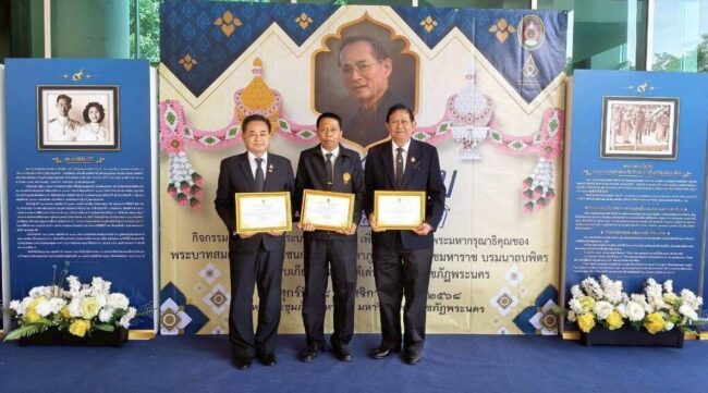 นายสลากุล ประเสริฐดี, นายปิยะศักดิ์ พงศ์อัมพรศักดา และนายปรกธณ แสงนิล ได้รับมอบเกียรติบัตร”พ่อดีเด่นแห่งชาติราชภัฎพระนคร” ครั้งที่ ๑๐ พฤศจิกายน 2568 เนื่องในโอกาสกิจกรรมวันคล้ายวันพระราชสมภพ พระบาทสมเด็จพระบรมชนกาธิเบศร มหาภูมิพลอดุลยเดชมหาราช บรมนาถบพิตร วันพ่อแห่งชาติ ณ หอประชุมภัทรมหาราช วิทยาลัยราชภัฎพระนคร