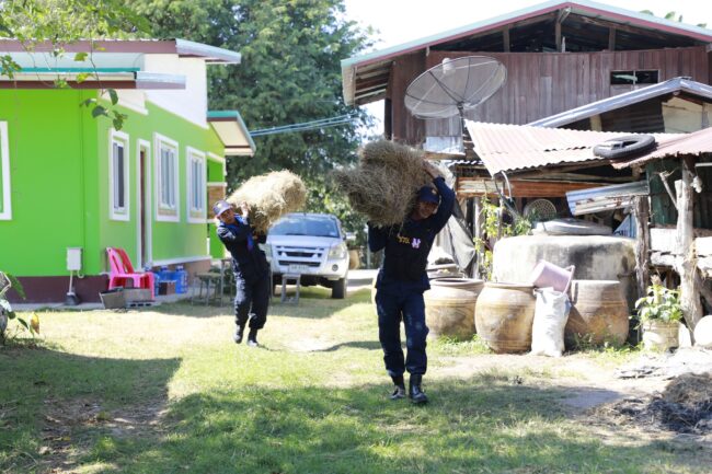 โดยในวันนี้(18ธ.ค.68) ทางผู้นำชุมชนได้ไปรับเอาหญ้าแห้งอัดฟ่อนที่ทางกรมปศุสัตว์ ได้นำมามอบให้เมื่อวาน(17ธ.ค.68) พวกตนที่เป็น ชรบ. ร่วมกับกำนัน ผู้ใหญ่บ้าน และผู้นำชุมชน รวมถึงชายฉกรรจ์ที่ช่วยดูแลความปลอดภัยของหมู่บ้าน ก็ได้ช่วยกันนำหญ้าอัดแห้งไปให้วัวควายของชาวบ้าน ที่ผูกล่ามไว้บริเวณสวนหลังบ้านได้กินด้วย