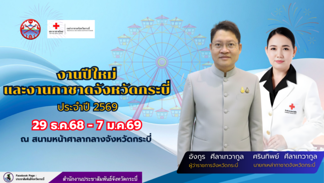 จังหวัดกระบี่ชวนเชิญเที่ยวงานปีใหม่และงานกาชาด 29 ธ.ค.68-7 ม.ค.69 พร้อมร่วมเสี่ยงโชคลุ้นรางวัลมัจฉากาชาด และสลากกาชาดการกุศล