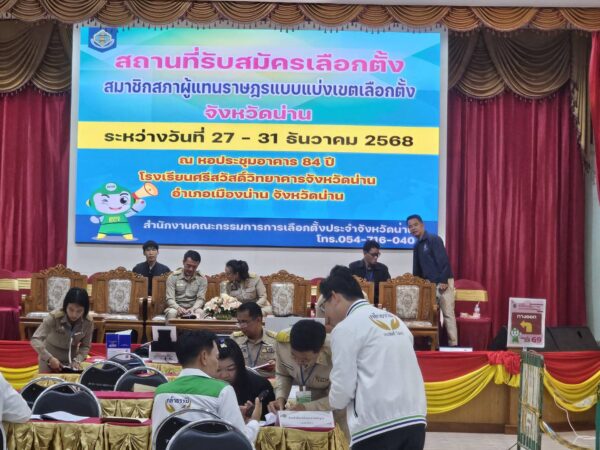 วันนี้ 27 ธ.ค. 68  เมื่อเวลา 08.00 น. ที่ สถานที่รับสมัครรับเลือกตั้ง ส.ส. จังหวัดน่าน ที่หอประชุมอาคาร 84 ปี โรงเรียนศรีสวัสดิ์วิทยาคารจังหวัดน่าน อำเภอเมืองน่าน จังหวัดน่าน บรรยากาศการรับสมัครสมาชิกสภาผู้แทนราษฎรแบบแบ่งเขตเลือกตั้งในพื้นที่จังหวัดน่าน เป็นไปอย่างคึกคัก เหล่าผู้สมัครจากพรรคการเมืองทั้งหน้าเก่าและหน้าใหม่เดินทางเข้ายื่นเอกสารการสมัครพร้อมกองเชียร์ โดยทยอยเดินทางมาลงทะเบียนล่วงหน้าก่อนเวลาเปิดรับสมัคร โดยมีกองเชียร์นำป้ายและพวงมาลัยมาให้กำลังใจอย่างเนืองแน่น  สำหรับการรับสมัครในช่วงเช้า มีพรรคการเมืองส่งผู้สมัครเข้าร่วมรวม 11 พรรค ประกอบด้วย พรรคกล้าธรรม, พรรคภูมิใจไทย, พรรคประชาธิปัตย์, พรรคเพื่อไทย, พรรคประชาชน, พรรคไทยก้าวใหม่, พรรคโอกาสใหม่, พรรคไทยภักดี, พรรคพลังประชารัฐ, พรรคปวงชนไทย และพรรครวมไทยสร้างชาติ