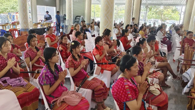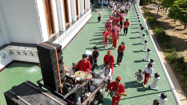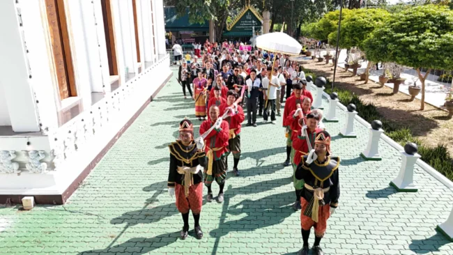 ทั้งนี้ผู้ที่มาร่วมพิธีจะแต่งชุดไทยพื้นถิ่นกับชุดไทยย้อนยุค และมีกลุ่มชาติพันธุ์มาร่วมพิธี ประกอบด้วย ชาวไทยพื้นถิ่น-ชาวไทยเชื้อสายจีน-ลาวครั่ง-ไทยพวน-ไทยมอญ-กะเหรี่ยง-ไทยทรงดำ ทั้งเด็ก ผู้ใหญ่ จะถือดาบมาร่วมขบวนแห่กันอย่างคึกคัก โดยได้อัญเชิญดาบขึ้นแท่นบนเวที พระสงฆ์สวดเจริญพระพุทธมนต์ ประกอบพิธี เจิมและ ผูกผ้าแพรที่ดาบใหญ่มหามงคล
