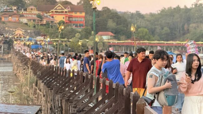 กาญจนบุรี-หยุดยาวปีใหม่ นักท่องเที่ยวทะลักแน่นสังขละบุรี โดยเฉพาะ “สะพานไม้” แทบไม่มีที่ให้เดิน ตำรวจพร้อมอำนวยความสะดวก ผู้ประกอบการรับอานิสงส์เงินสะพัด