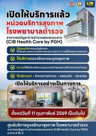 จากนโยบายและข้อสั่งการของ พล.ต.อ.กิตติ์รัฐ พันธุ์เพ็ชร์ ผบ.ตร.และ พล.ต.อ.กรไชย คล้ายคลึง รอง ผบ.ตร.(บร.)ให้โรงพยาบาลตำรวจเปิดให้บริการ ศูนย์บริการดูแลรักษาสุขภาพ โรงพยาบาลตำรวจ สาขากองบัญชาการตำรวจสอบสวนกลาง (CIB Health Care by PGH) อย่างเป็นทางการแล้ว เพื่อรองรับการดูแลสุขภาพของข้าราชการตำรวจ ครอบครัว และประชาชนทั่วไป สำหรับศูนย์บริการดังกล่าว เปิดให้บริการอย่างเป็นทางการตั้งแต่วันที่ 11 กุมภาพันธ์ 2569 เป็นต้นไป ณ อาคาร A ชั้น 2 กองบัญชาการตำรวจสอบสวนกลาง