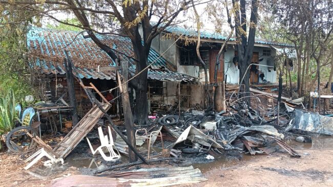 จุดเกิดเหตุที่ถูกไฟไหม้บริเวณลานหน้าบ้านที่อยู่ติดกับต้นไม้ ซึ่งเป็นที่เก็บของใช้ ตู้เย็น หม้อหุงข้าว และ รถจักรยานยนต์สภาพเก่าที่ไม่ได้ใช้ถูกไฟไหม้เสียหายไป 1 คันขณะนั้นได้เกิดควันไฟปะทุขึ้นบนหลังคาบ้านทางด้านทิศตะวันออกเพื่อนบ้านจึงรีบตักน้ำนำบันไดมาปีนขึ้นไปดับไฟบริเวณจุดนั้น โชคดีไม่มีผู้ได้รับบาดเจ็บหรือเสียชีวิต มูลค่าความเสียหายหลักหมื่นบาท