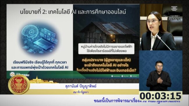 เมื่อวันที่ 10 เม.ย. 2569 น.ส.สุภานันท์ ปัญญาทิพย์ ส.ส.เชียงใหม่ เขต 6 พรรคกล้าธรรม ได้ลุกขึ้นอภิปรายในการประชุมร่วมกันของรัฐสภา เพื่อพิจารณาเรื่องด่วนคณะรัฐมนตรี (ครม.) แถลงนโยบายต่อรัฐสภา โดยเฉพาะนโยบายเรียนฟรี มีงานทำ ว่า นโยบายนี้อาจไปไม่รอด เพราะในพื้นที่ จ.เชียงใหม่ เขต 6 ซึ่งประกอบด้วย อ.พร้าว อ.เชียงดาว อ.เวียงแหง และ อ.ไชยปราการ หลายหมู่บ้านยัง “ไร้แสงสว่าง” ไฟฟ้าเข้าไม่ถึง! ต้องทนใช้โซลาร์เซลล์แบบตามมีตามเกิด ซึ่งไม่พอใช้ จะเอาไฟฟ้าที่ไหนไปเสียบปลั๊ก ต่ออินเทอร์เน็ตให้เด็กเรียนออนไลน์ วอนรัฐบาลลงมาดูของจริง ขยายเขตไฟฟ้าให้ครอบคลุมพื้นที่ห่างไกลก่อนขายนโยบาย