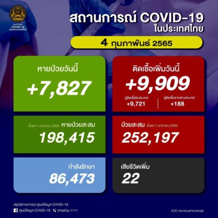 พบจํานวนผู้ติดเชื้อโควิด-19 รายใหม่เพิ่มขึ้น 9,909 ราย แบ่งเป็นผู้ติดเชื้อรายใหม่ 9,721 ราย ผู้ป่วยมาจากต่างประเทศ 188 ราย มีผู้เสียชีวิตเพิ่ม 22 คน ยอดผู้เสียชีวิตสะสม 552 คน ตั้งแต่ 1 มกราคม – 3 กุมภาพันธ์ 2565 มีผู้ป่วยสะสม 252,197 ราย