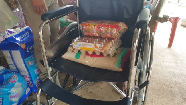 จากนั้นได้นำคณะ เข้ามอบรถวีลแชร์ ให้กับ นายประชุม รวยสุข อายุ 80 ปี และนางราตรี หอมเกษร อายุ 76 ปี ที่เป็นผู้ป่วยติดเตียง ณ เพลิงพัก ม.9 ต.บางเสร่ อ.สัตหีบ ที่นายประชุม รวยสุข อายุ 80 ปี สามีป่วยนิ้วเท้าขวาถูกตัด จากถอนเล็บครุด จนเดินเหิรไม่สะดวก ส่วนนาง ราตรี หอมเกษร อายุ 76 ปี ภรรยาที่ ป่วยเป็นอัมพฤก ขาขยับไม่ได้ แขนไม่มีแรง ต้องใส่แพมเพิท ตลอดเวลา จึงได้นำคณะเข้ามอบรถวีลแชร์ พร้อมเครื่องอุปโภคบริโภคให้กับ 2 ตายาย ในโอกาสเดียวกันนี้ด้วย ยังความปลื้มปิติและดีใจเป็นอย่างยิ่งให้กับสองตายายในครั้งนี้