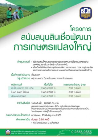 นายธนารัตน์ งามวลัยรัตน์ ผู้จัดการธนาคารเพื่อการเกษตรและสหกรณ์การเกษตร (ธ.ก.ส.) เปิดเผยว่า ตามมติครม. เมื่อวันที่ 22 พ.ย. 2559 และวันที่ 11 ม.ค. 2565 ที่ผ่านมา ให้ ธ.ก.ส.ดำเนินโครงการสนับสนุนสินเชื่อเพื่อพัฒนาการเกษตรแปลงใหญ่ โดยมีวัตถุประสงค์ในการส่งเสริมให้เกษตรกรรวมกลุ่ม และจัดหาปัจจัยการผลิตร่วมกัน ซึ่งจะช่วยลดต้นทุนและเพิ่มขีดความสามารถทางการแข่งขันทั้งการผลิต การแปรรูป การรวบรวมผลผลิตเพื่อจำหน่าย โดยสนับสนุนเงินทุนให้แก่กลุ่มเกษตรกร วิสาหกิจชุมชน และสหกรณ์การเกษตร เพื่อเป็นค่าใช้จ่าย ค่าลงทุน วงเงินสินเชื่อรวม 20,000 ล้านบาท อัตราดอกเบี้ยทั้งโครงการ 3.01 ต่อปี โดยกลุ่มเกษตรกรฯจ่ายดอกเบี้ยเพียงร้อยละ 0.01 ต่อปี หรือล้านละร้อย