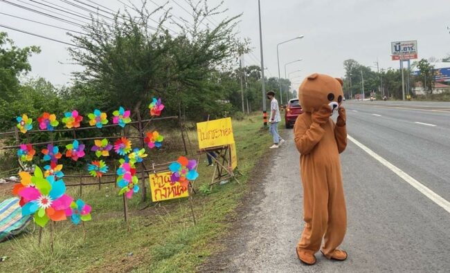 บุรีรัมย์-ชีวิตไม่สิ้น ก็ต้องดิ้นสุดใจ อดีตสาวโรงงาน ตกงานจากโควิด ต้องหาเงินเลี้ยงลูก ใส่ชุดมาสคอตหมี ขายใบกระท่อมริมทาง ปรากฎรายได้ดีวันละพัน คนแห่ซื้อตรึม