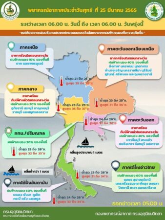 เมื่อวันที่ 25 มี.ค.65 กรมอุตุนิยมวิทยา พยากรณ์อากาศ 24 ชั่วโมงข้างหน้า หย่อมความกดอากาศต่ำเนื่องจากความร้อนปกคลุมภาคเหนือตอนบน ทำให้ประเทศไทยตอนบนมีอุณหภูมิสูงขึ้น โดยมีอากาศร้อนกับมีฟ้าหลัวในตอนกลางวันประกอบกับลมใต้และลมตะวันออกเฉียงใต้ที่พัดปกคลุมภาคเหนือตอนล่าง ภาคตะวันออกเฉียงเหนือ ภาคกลาง รวมทั้งกรุงเทพมหานครและปริมณฑล และภาคตะวันออกมีกำลังอ่อนลง ทำให้ประเทศไทยตอนบนมีฝนลดลง