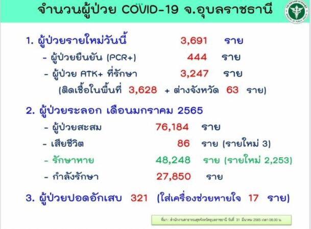 เจ้าหน้าที่สำนักงานป้องกันควบคุมโรคที่ 10 อุบลราชธานี ยังตั้งจุดตรวจ ATK ให้กับประชาชนที่ยังเป็นกลุ่มเสี่ยงในพื้นที่อำเภอเมือง และอำเภอวารินชำราบ หลังพบผู้ป่วยทั้งจังหวัดสูงวันละกว่า 3,000 ราย ต่อเนื่องมา 5 วัน โดยล่าสุดพบผู้ป่วย 3,691 ราย โดยเป็นการตรวจ PCR 444 คน ที่เหลืออีก 3,247 คนจาก ATK และมีผู้เสียชีวิตเพิ่ม 3 คน โดยเป็นผู้ป่วยสูงอายุ 75-95 ปี และเป็นผู้ป่วยติดเตียง มีโรคประจำตัว รวมมีผู้เสียชีวิตการระบาดรอบนี้ 86 คน โดยเป็นกลุ่มอายุ 60 ปีขึ้นไป สูงถึงร้อยละ 67.7