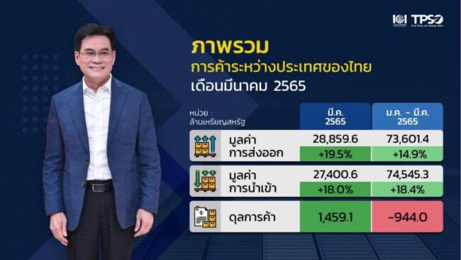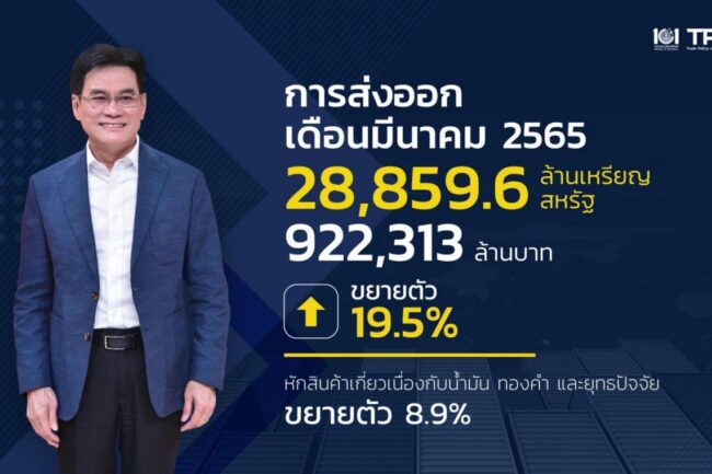 นายจุรินทร์ กล่าวว่าตัวเลขการส่งออกเดือนมีนาคม 65 +19.5% มีมูลค่ารวม 922,313 ล้านบาท ถือว่ามูลค่าการส่งออกสูงที่สุดในรอบ 30 ปี นับตั้งแต่มีการบันทึกสถิติการส่งออกตั้งแต่ปี 2534 ดุลการค้า +34,960 ล้านบาท สินค้าสำคัญ 3 หมวดประกอบด้วย1.สินค้าการเกษตร 2.สินค้าเกษตรอุตสาหกรรม 3.สินค้าอุตสาหกรรม