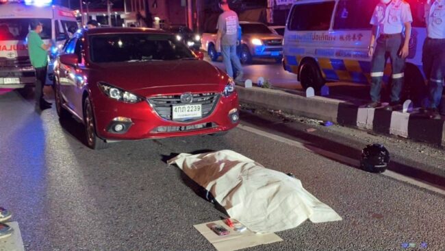 วันที่ 4 พฤษภาคม 65 เวลา 21:40 น. จนท.ตำรวจได้รับแจ้งเหตุ รถจยย.เสียหลักล้ม รถเก๋งขับมาทับชายเสียชีวิตติดใต้ท้องรถ บริเวณหน้าร้านเฮียก่ำ โรตีสายไหม ถนนราชพฤกษ์ ขาออกมุ่งหน้าถนนรัตนาธิเบศร์ อำเภอเมืองจังหวัดนนทบุรี พร้อมด้วยแพทย์จากสถาบันนิติวิทยาศาสตร์ และเจ้าหน้าที่มูลนิธิปอเต็กตึ้ง รีบตรวจสอบ