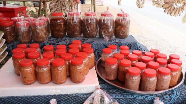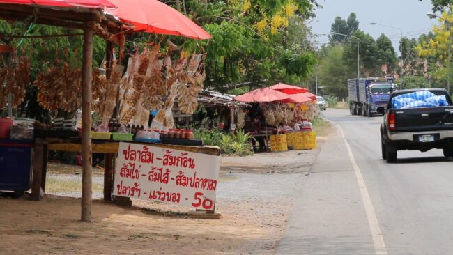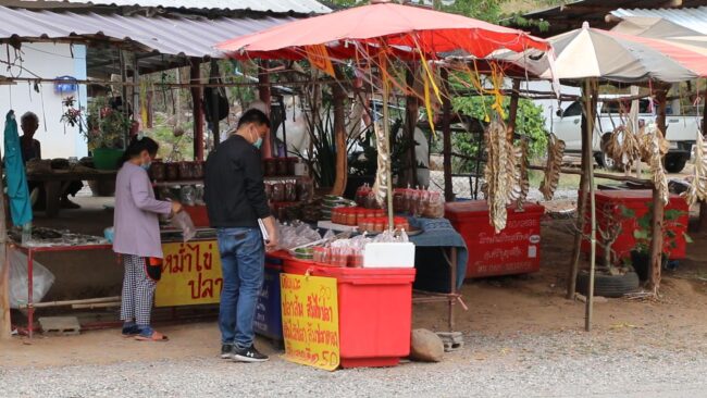 แต่เมื่อการหาปลาที่มีจำนวนที่มากขึ้น ประกอบกับความต้องการในกลุ่มอาหารแปรรูปและอาหารที่สามารถเก็บไว้รับประทานได้นาน ชาวชุมชน จึงนำอาหารที่แปรรูปและได้มีการถนอมอาหาร มาวางจำหน่ายริมถนน จนวันนี้ริม 2 ข้างทางระยะทางกว่า 2 กม. รอยต่อระหว่าง 2 จังหวัดจึงมีร้านค้า ที่คนในชุมชนนำสินค้ามาจำหน่ายนั้นมีเป็นจำนวนมาก