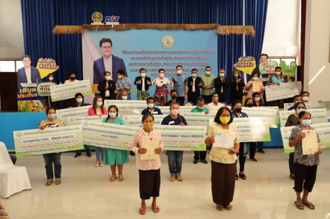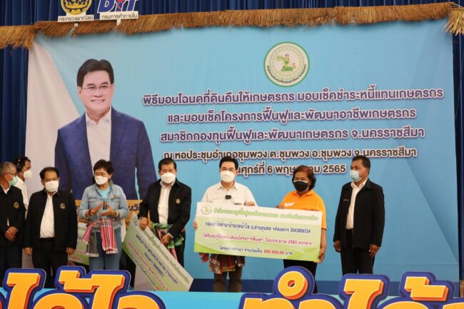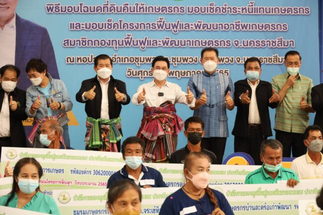“และเกษตรกรที่เป็นหนี้และเป็นสมาชิกกองทุนฟื้นฟูและพัฒนาเกษตรกรเราก็ช่วย โดยกองทุนฟื้นฟูและพัฒนาเกษตรกรตั้งขึ้นเมื่อปี 2542 ในสมัยรัฐบาลชวนสอง(นายชวน หลีกภัย เป็นนายกรัฐมนตรีครั้งที่สอง) โดยตนเป็นรัฐมนตรีประจำสำนักนายกรัฐมนตรี ยกมือให้พระราชบัญญัติกองทุนฟื้นฟูและพัฒนาเกษตรกรถือกำเนิดขึ้น ช่วยเกษตรกรที่เป็นหนี้ไม่ให้ถูกยึดที่ดินทำกิน ให้มาเป็นหนี้ของกองทุนฯ โดยเงื่อนไขดอกเบี้ยพิเศษและไม่มีการยึดที่ดินทำกิน เมื่อผ่อนหมดก็จะคืนโฉนดที่ดินให้ วันนี้ได้เงินกองกลางมาเพิ่มอีก 2,000 ล้านบาท เพื่อซื้อหนี้และมีโครงการพัฒนาเกษตรกร สำหรับวันนี้ที่อำเภอชุมพวง จังหวัดนครราชสีมา รวม 4,826,000 บาท และที่สำคัญเงินนี้ทุกบาททุกสตางค์ต้องเอาไปใช้ให้เกิดประโยชน์กับกลุ่มของเราจริงๆ เพื่อให้มีรายได้ มีความยั่งยืนในการดำรงชีวิตที่เหลือเอามาใช้หนี้เพื่อไถ่โฉนดคืนเพื่อให้เป็นไทกับตัว ยืนหยัดด้วยตัวเองต่อไป ตามเป้าหมายของกองทุนฟื้นฟูและพัฒนาเกษตรกร” รองนายกรัฐมนตรีและรัฐมนตรีว่าการกระทรวงพาณิชย์กล่าว