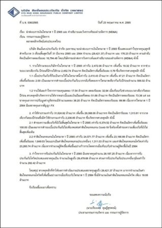 วันที่ 23 พ.ค.65 บริษัทสินมั่นคงประกันภัย จำกัด (มหาชน) ได้ทำหนังสือแจ้งต่อ ก.ล.ต. ส่งงบการเงินไตรมาส 1 ปี 2556 ซึ่งแสดงผลกำไร(ขาดทุน)สุทธิ สำหรับงวด 3 เดือนสิ้นสุดวันที่ 31 มี.ค.2565 และ 2564 จำนวน (29,421.37) ล้านบาท และ 173.23 ล้านบาท คิดเป็นอัตราดอกเบี้ยลดลงร้อยละ 16,794.48 ซึ่งการวิเคาระห์และคำอธิบายของฝ่ายจัดการดังนี้