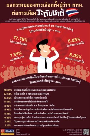 ศูนย์สำรวจความคิดเห็น “นิด้าโพล” สถาบันบัณฑิตพัฒนบริหารศาสตร์ (นิด้า) เปิดเผยผลสำรวจของประชาชน เรื่อง “ผลกระทบ ของการเลือกตั้งผู้ว่าฯ กทม. ต่อการเมืองระดับชาติ” ทำการสำรวจระหว่างวันที่ 25-27 พฤษภาคม 2565 จากประชาชนที่มีอายุ 18 ปีขึ้นไป กระจายทุกภูมิภาค ระดับการศึกษา อาชีพ และรายได้ ทั่วประเทศ รวมทั้งสิ้น จำนวน 1,322 หน่วยตัวอย่าง เกี่ยวกับผลกระทบของการเลือกตั้ง ผู้ว่าฯ กทม. ต่อการเมืองระดับชาติ